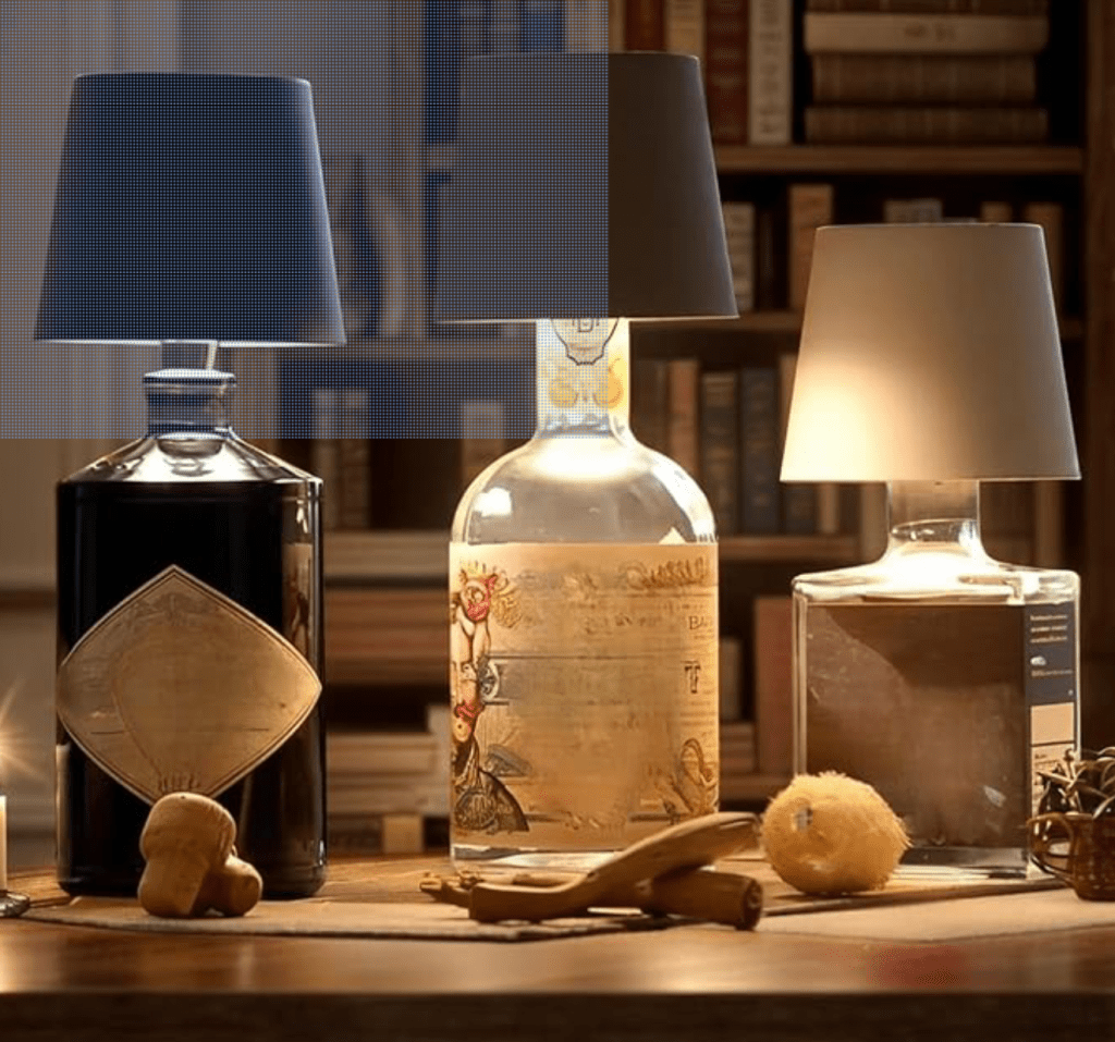 Do you have empty liquor bottles that you hate to throw away? Add lights or string lights to them and place them on table and the buffet! Click on the pictures for purchase information.
