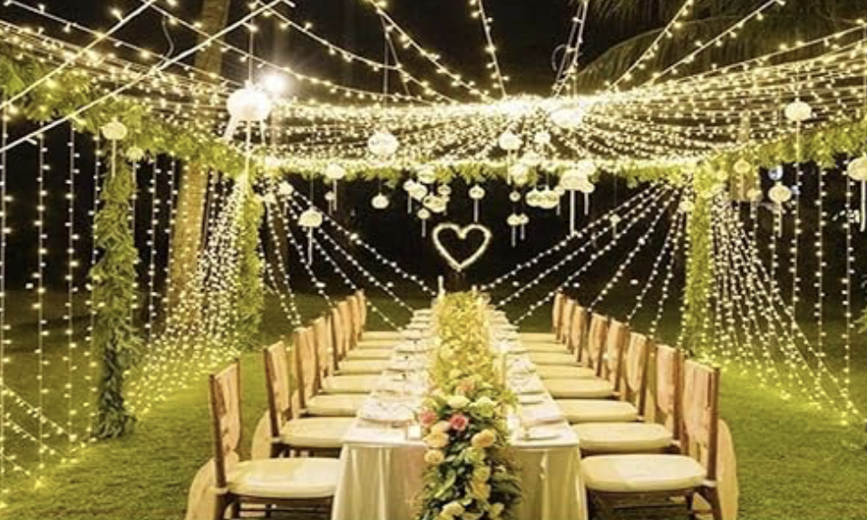 Paper lanterns hung from tree limbs are charmingly festive (use dark extension cords that will blend in). White Christmas lights or market lights also provide a magical twinkle effect. Use inexpensive tea lights set in clean glass jam jars to add ambience to your table settings.