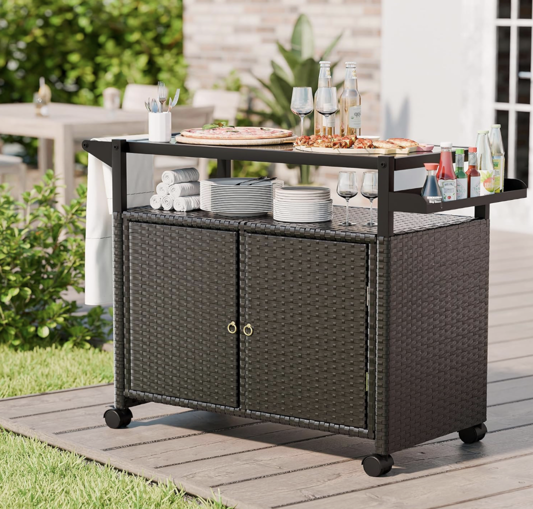 Stock a bar cart with essentials: glasses, ice, a cocktail shaker, and swizzle sticks. Simply wheel it back to the kitchen if supplies run low, then slide it back outside to keep things flowing.